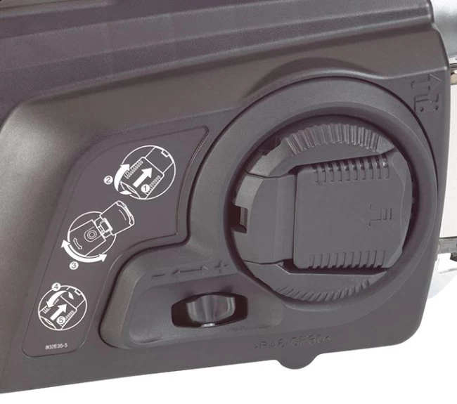 - Werkzeugloser Kettenspanner mit klappbarem Drehgriff und kleinem Rad für noch einfacheres Montieren und Spannen der Sägekette