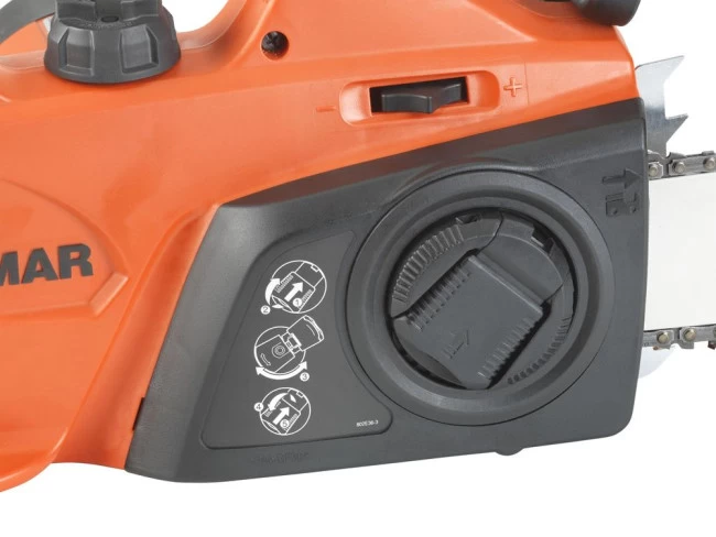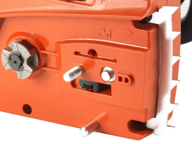 - Werkzeugloser Kettenspanner mit klappbarem Drehgriff und kleinem Rad für noch einfacheres Montieren und Spannen der Sägekette