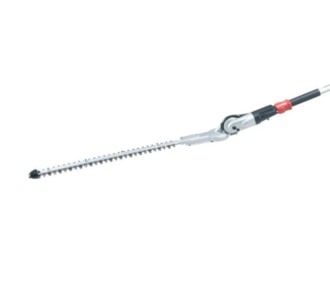 Heckenscherenaufsatz mit doppelseitigem Messerbalken 49 cm, in 13 Stufen um 135° verstellbar (90° oben, 45° unten), kann für leichten Transport vollständig eingeklappt werden.
