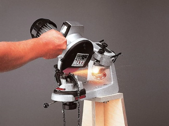 Das Kettenschärfgerät MAXX bietet praktische und effiziente Lösungen für professionelles Schärfen von Sägeketten. Insbesondere die automatische Klemmung der Sägekette in der Führungsschiene beim Herabdrücken des Schleifkopfes rationalisiert das Kettenschärfen. Serienmäßig mit Scheibenbeleuchtung und 3 Schleifscheiben für alle gängigen Dreilaschen-Sägeketten und Teilungen.