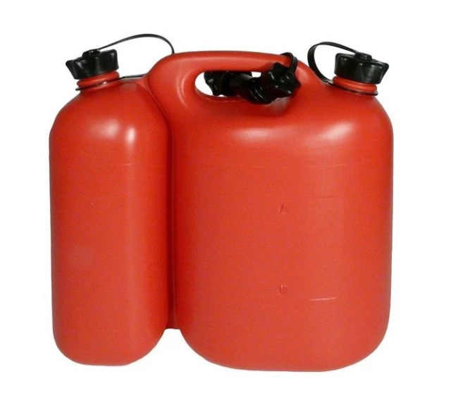 Standard-Kombi-Kanister für 5 Liter Kraftstoffgemisch und 3 Liter Kettenöl inklusive einer Ausgießtülle.
