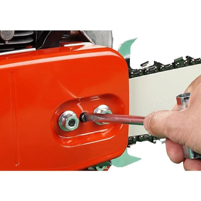 - Seitliche Kettenspannung für schnelles und bequemes Spannen der Sägekette
